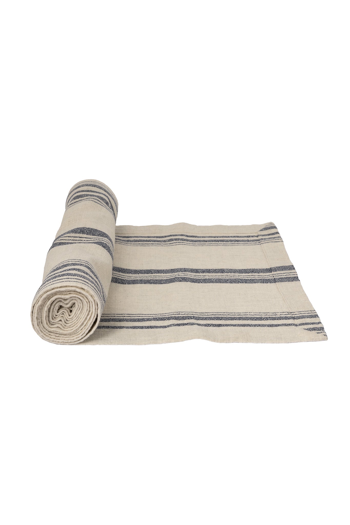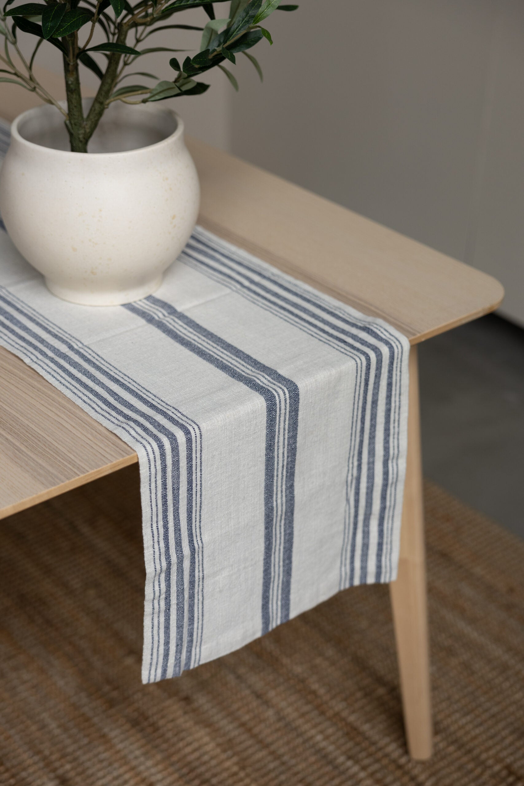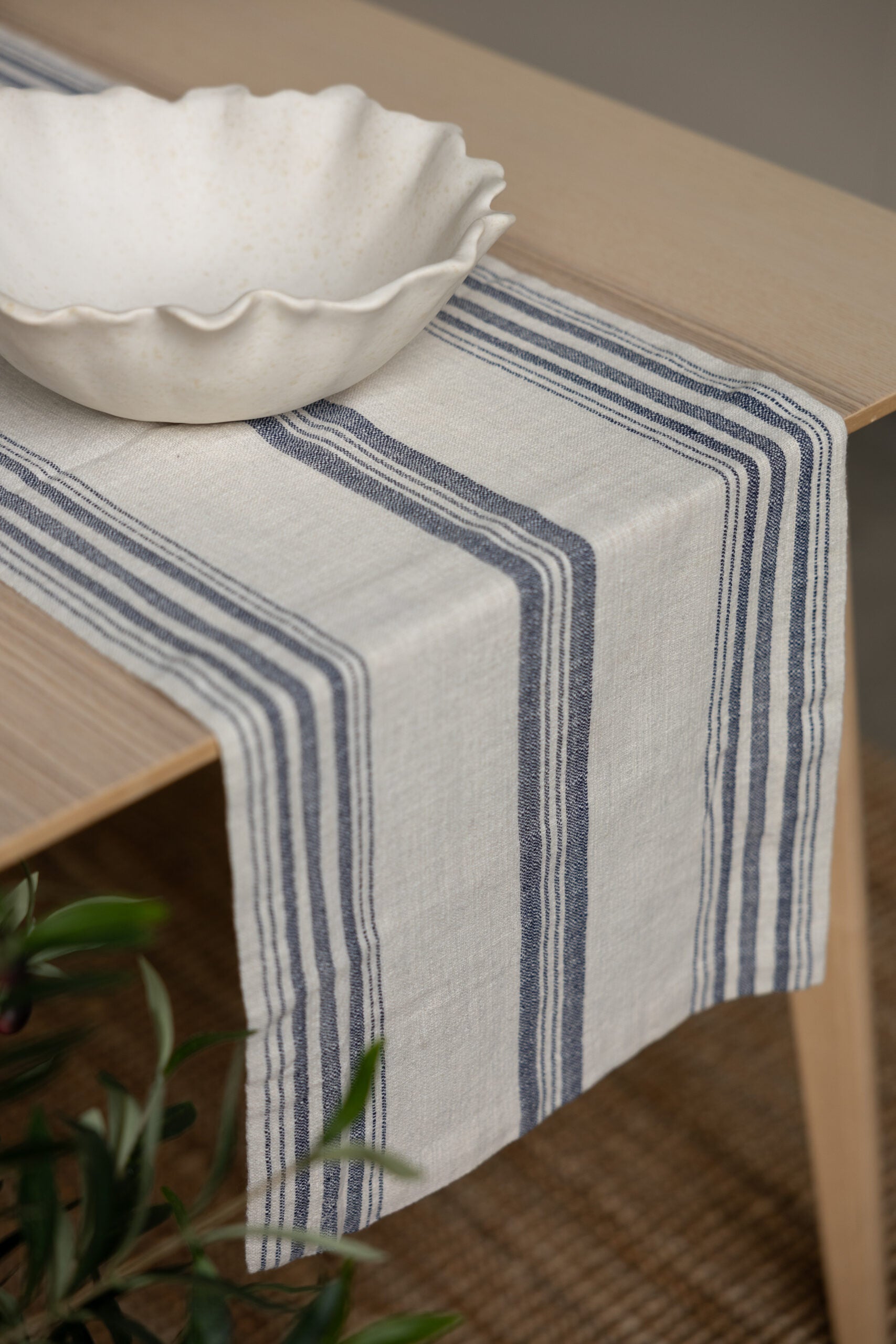 Lekker naturfarget løper med blå striper. Like fin til hverdags som til festbordet.
