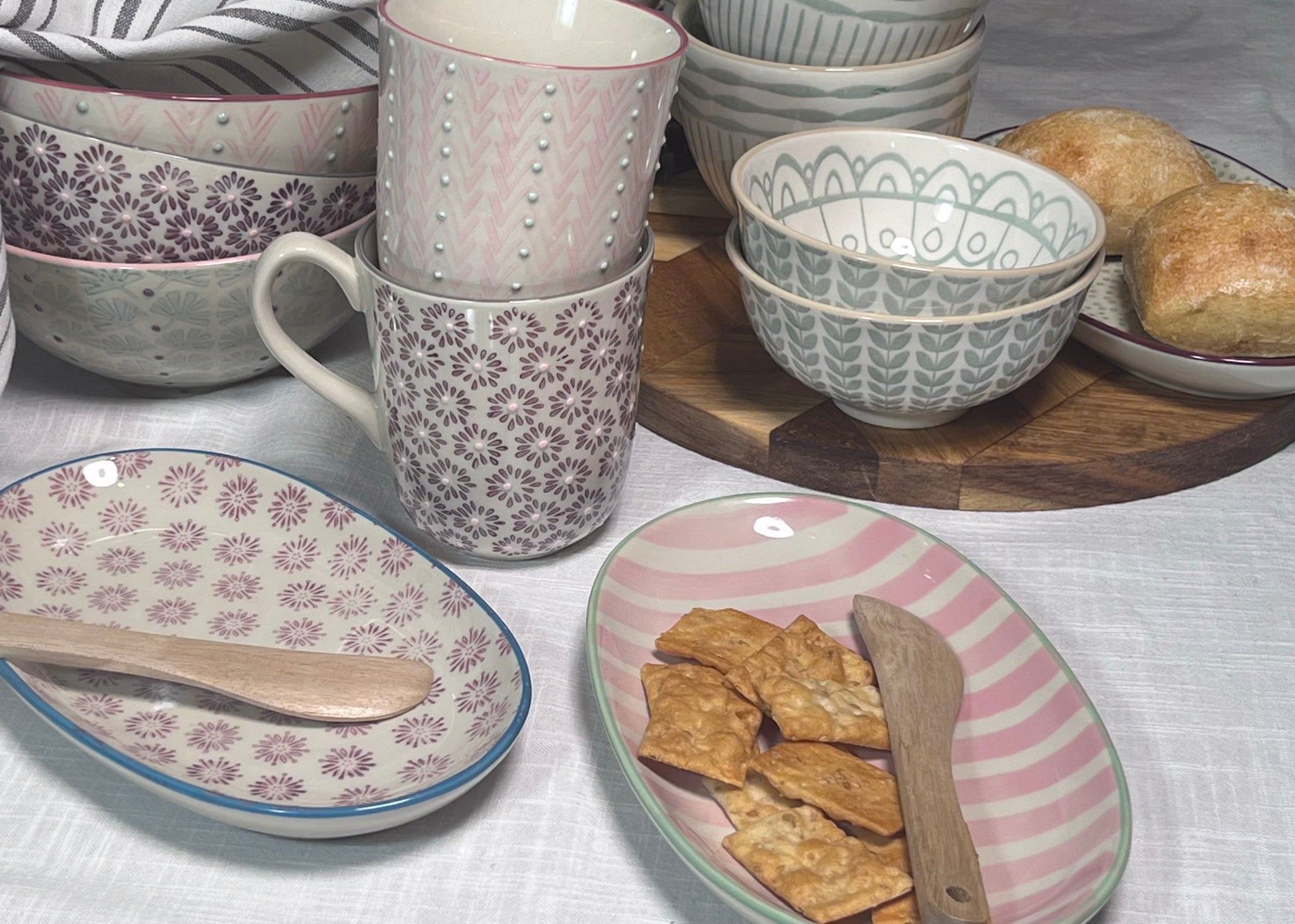 En serie med fire ulike farger og mønstre. Dempede fargenyanser som fint kan brukes om hverandre, mix og match. Mønsteret er håndmalt, slik at der kan være små forskjeller i designet.