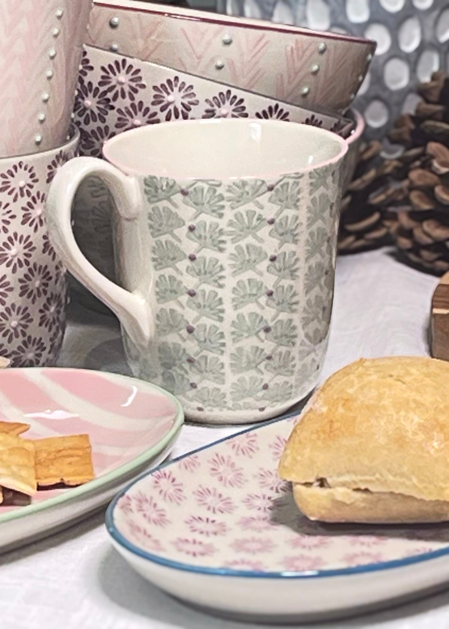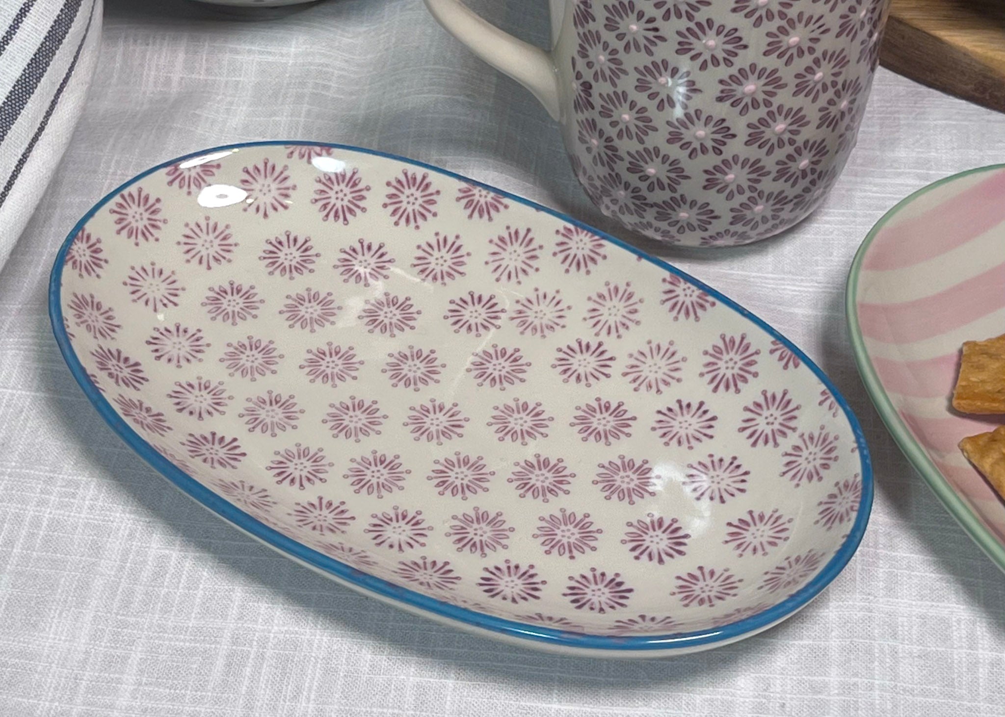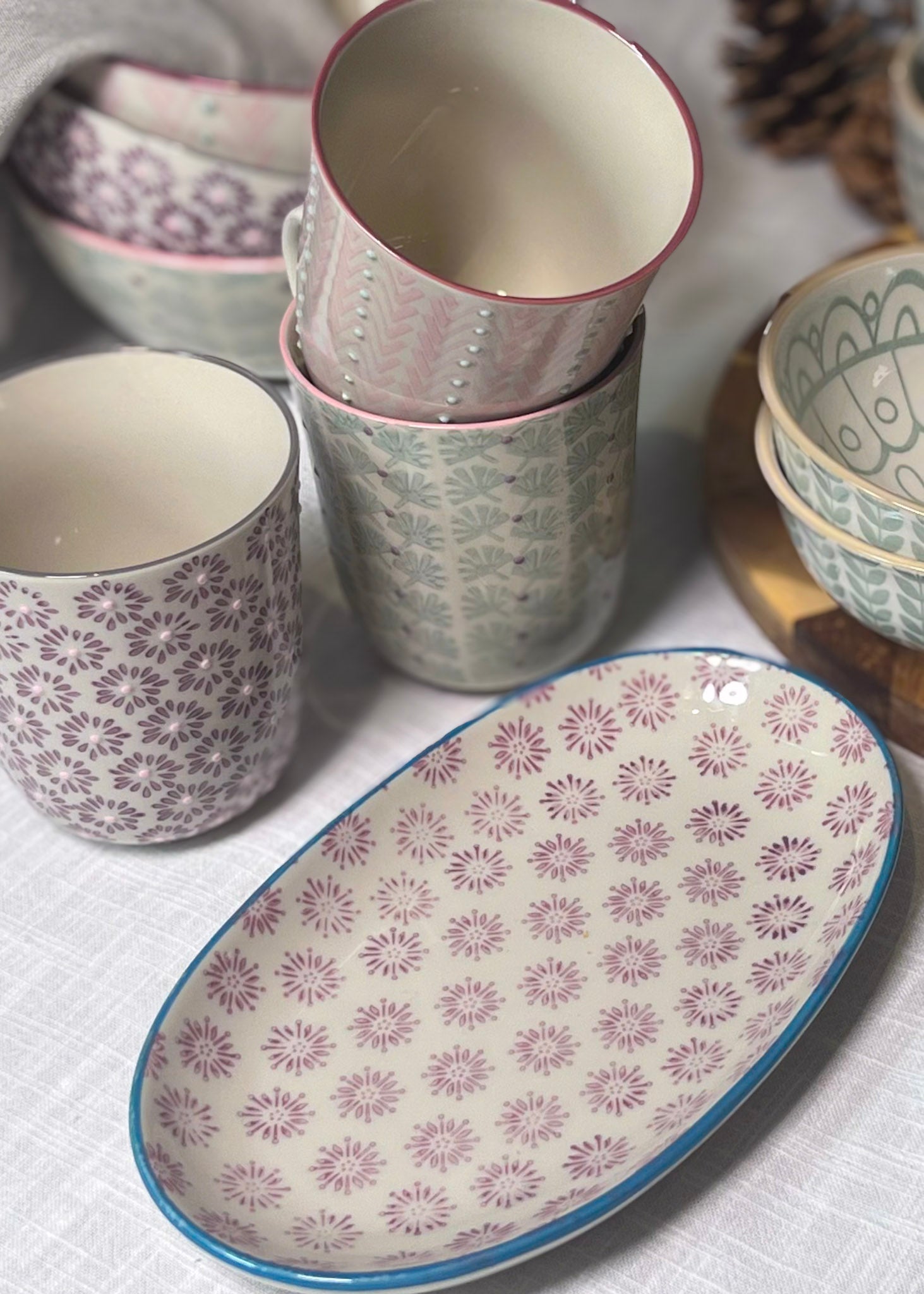 Patrizia tallerken i serien Originals fra Bloomingville. Kan også brukes som lite fat. En serie med fire ulike farger og mønstre. Grå keramikk i bunn. Dempede fargenyanser som fint kan brukes om hverandre, mix og match. Mønsteret er håndmalt, slik at der kan være små forskjeller i designet.