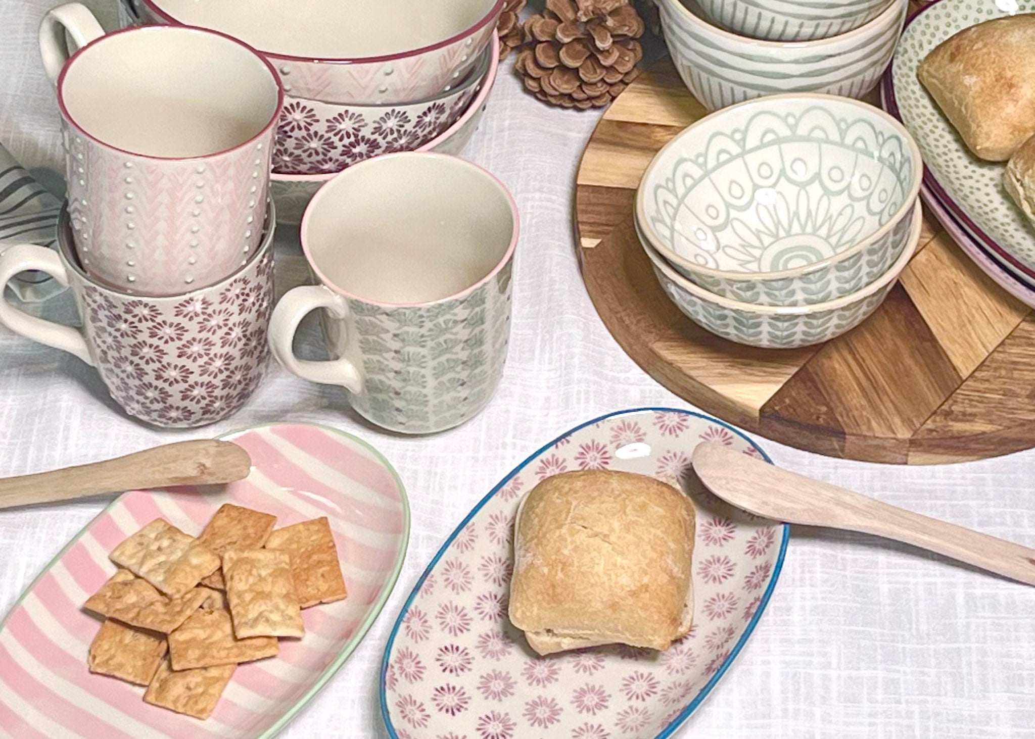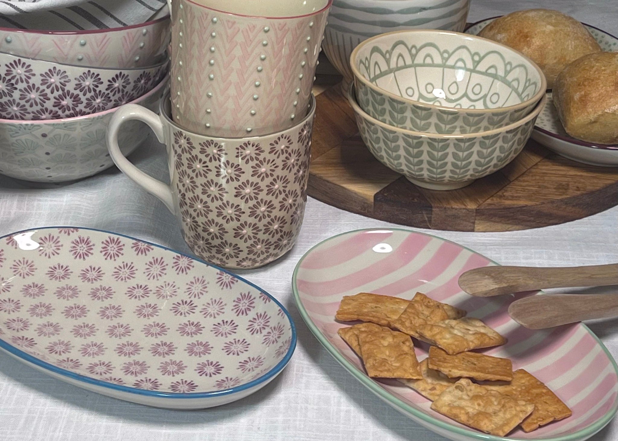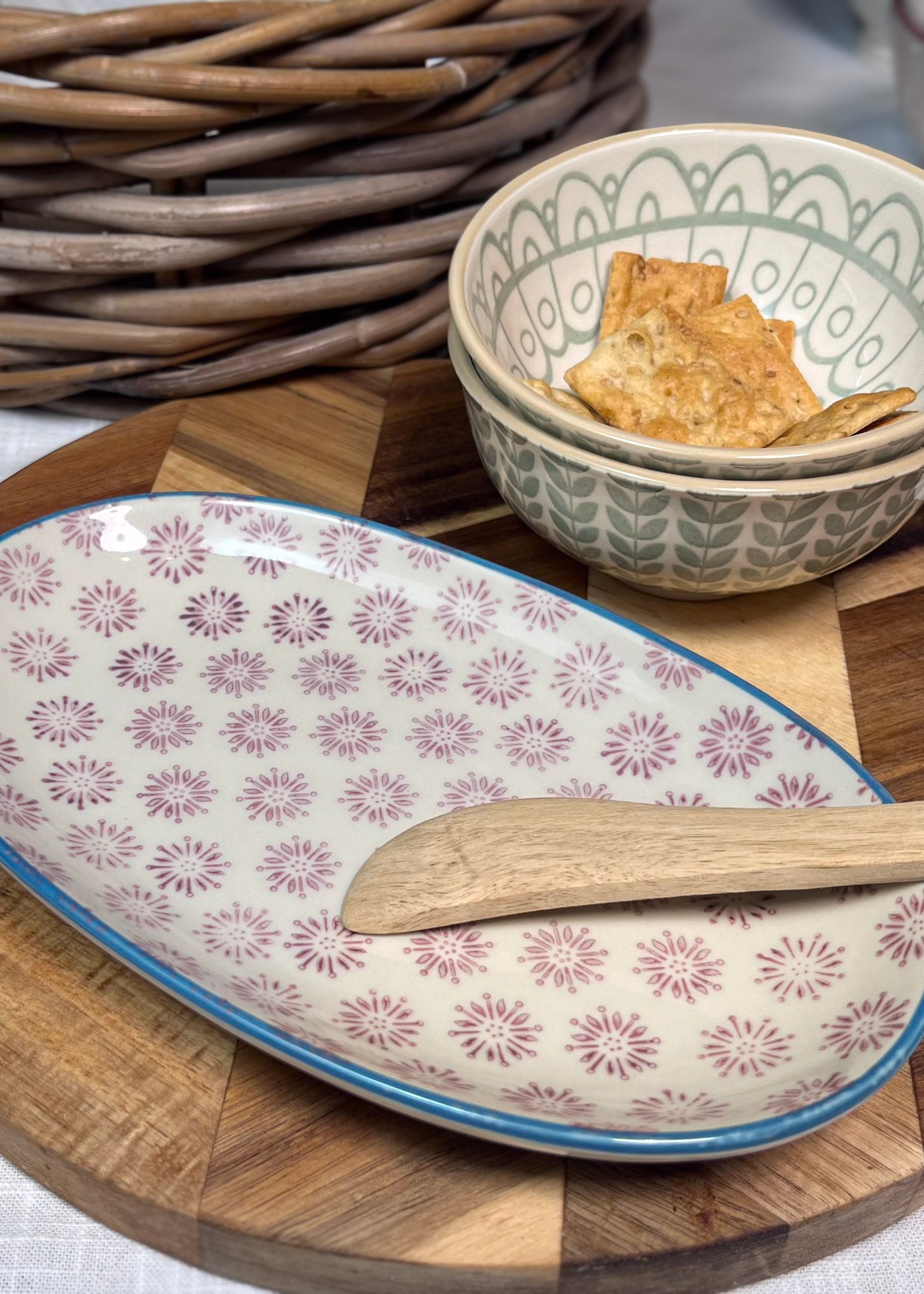 Patrizia tallerken i serien Originals fra Bloomingville. Kan også brukes som lite fat. En serie med fire ulike farger og mønstre. Grå keramikk i bunn. Dempede fargenyanser som fint kan brukes om hverandre, mix og match. Mønsteret er håndmalt, slik at der kan være små forskjeller i designet.